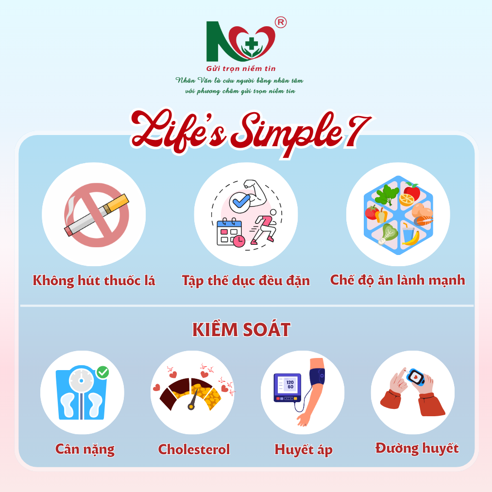 Bên cạnh việc nhận biết sớm các dấu hiệu nguy hiểm, chủ động phòng ngừa là cách hiệu quả để giảm nguy cơ đột quỵ và đột tử do tim. Theo khuyến nghị của các tổ chức tim mạch, mỗi người nên duy trì “Life’s Simple 7” – 7 nguyên tắc vàng giúp bảo vệ tim mạch và não bộ, bao gồm: